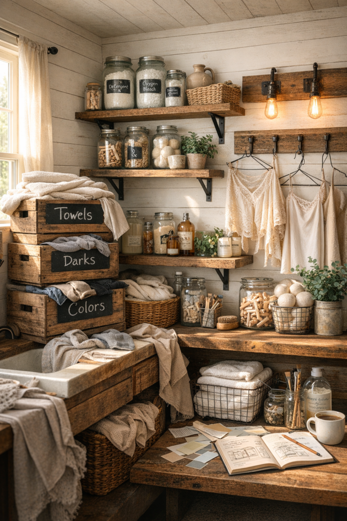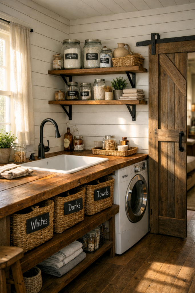 Add woven baskets for sorting whites and darks, mason jars for storing detergent, and a reclaimed wood countertop for folding laundry. The key to achieving this look is authenticity—let natural materials and muted tones shine. Even a small nook can transform into a cozy farmhouse retreat with the right details.